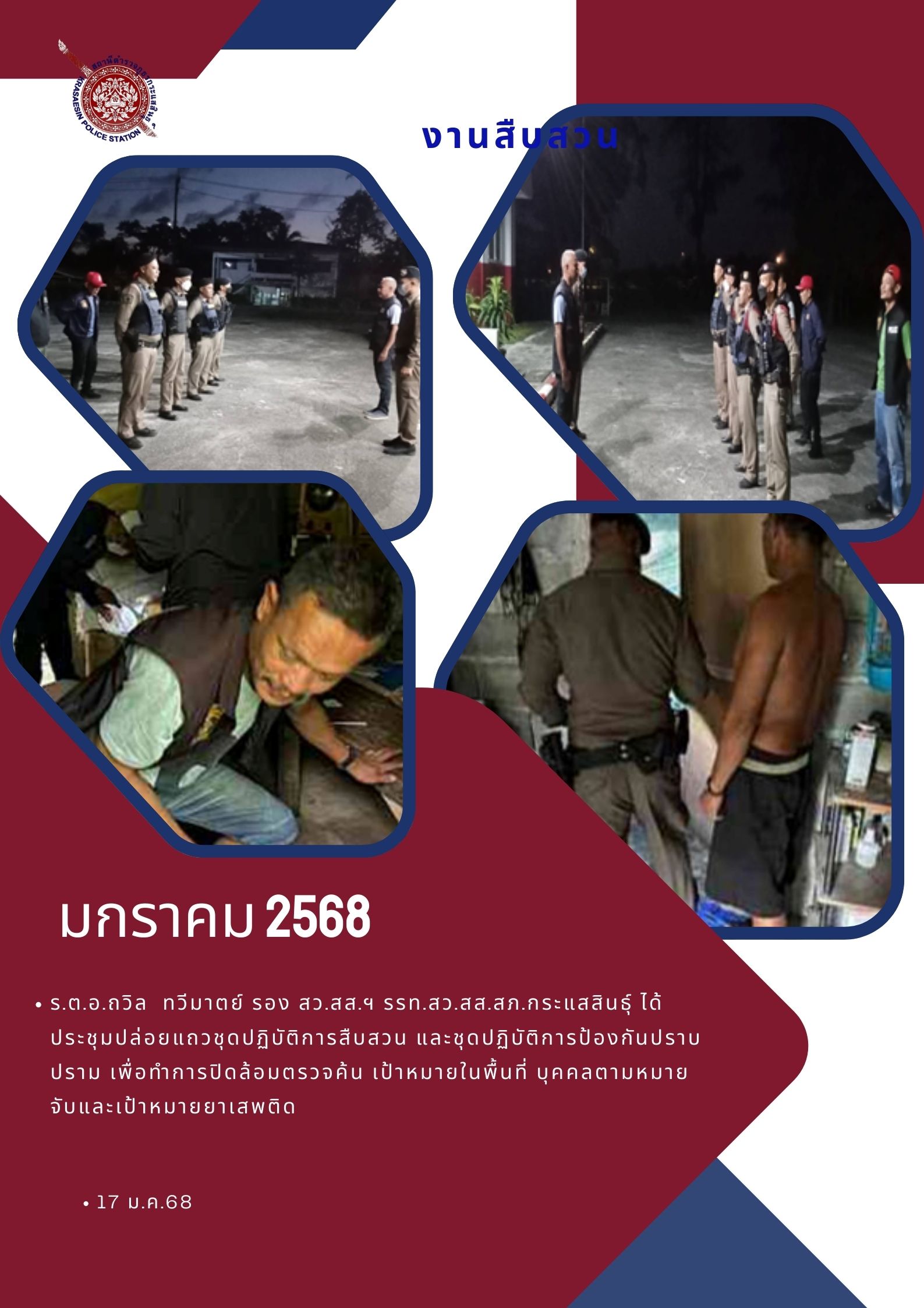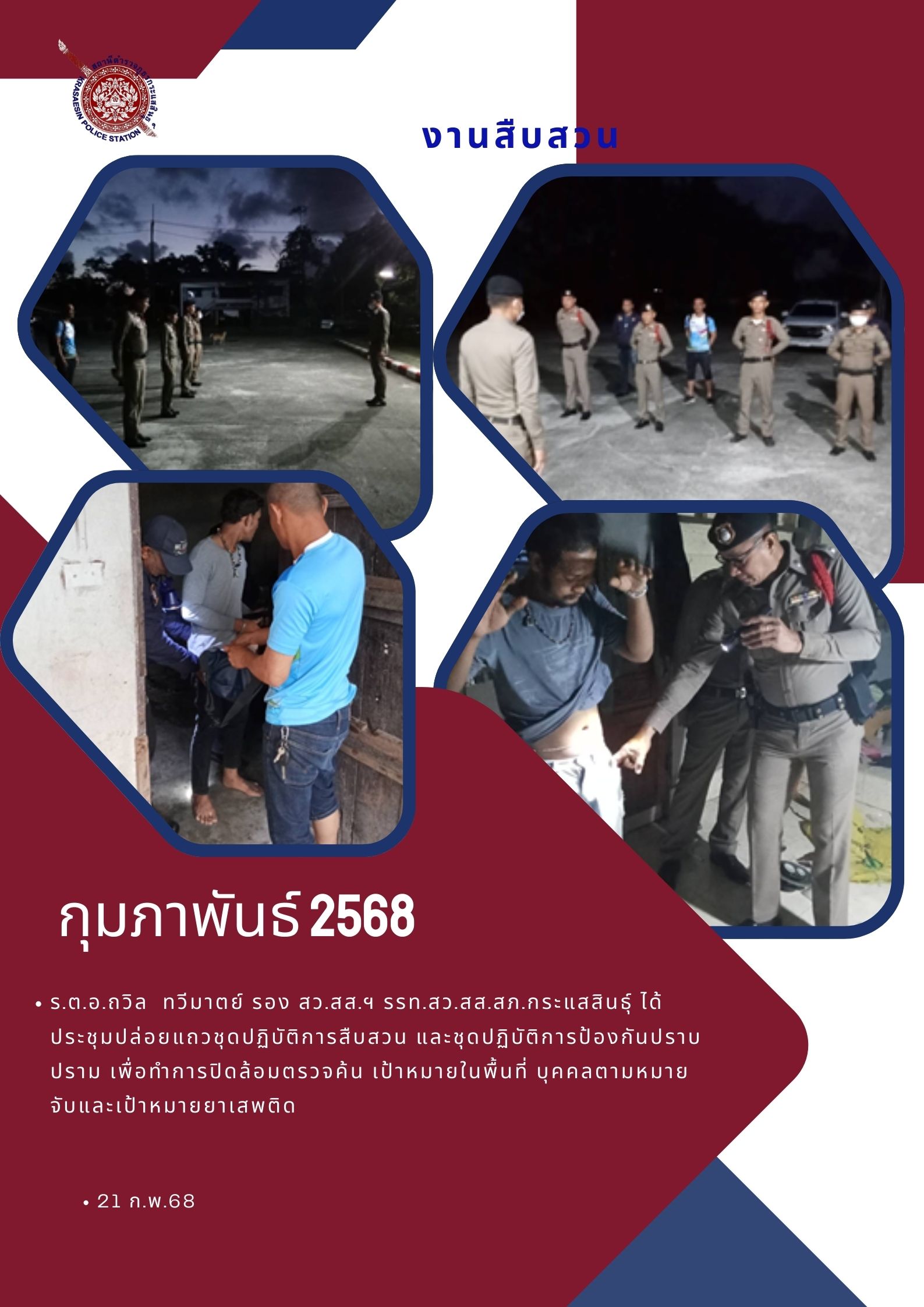 วันนี้ ๕ มีนาคม ๒๕๖๘ เวลา ๒๒.๐๕ น. ภายใต้อำนวยการของ พ.ต.อ.สมชาย จันยัง ผกก.สภ.กระแสสินธุ์ พ.ต.ท.สิร