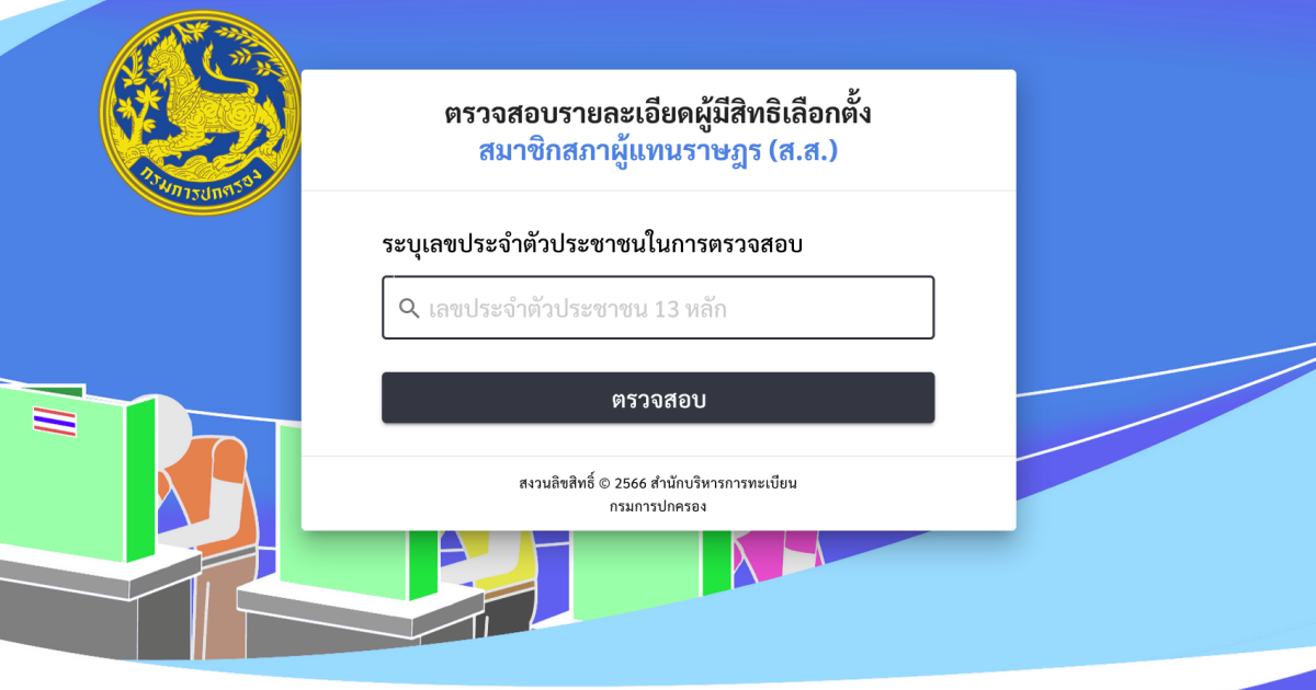 ตรวจสอบรายละเอียดผู้มีสิทธิเลือกตั้ง 24 เมษายน 2566 โดย admin / ข่าวประชาสัมพันธ์,ข่าวประชาสัมพันธ์,ข่าวฝากประชาสัมพันธ์,ไม่มีหมวดหมู่ Facebook iconFacebookTwitter iconTwitterLINE iconLine สมาชิกสภาผู้แทนราษฎร (ส.ส.) https://boraservices.bora.dopa.go.th/election/enqelection/ Click here Facebook iconFacebookTwitter iconTwitterLINE iconLine