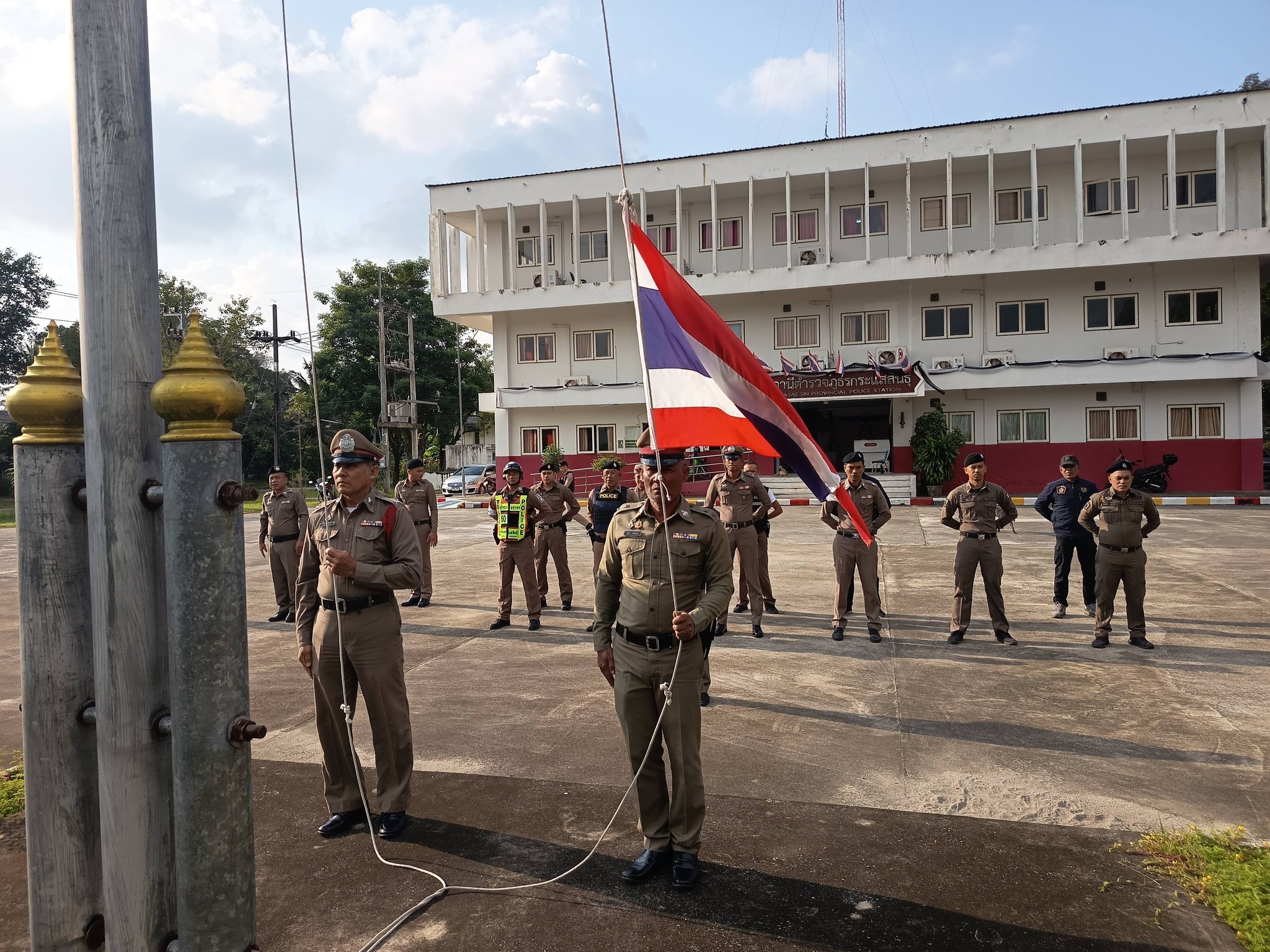 ข้าราชตำรวจ สภ.กระแสสินธุ์ เข้าแถวเคารพธงชาติ 2 กุมภาพันธ์ 2569 พันตำรวจเอกสมศักดิ์ มีสัจจานนท์ ผู้ก