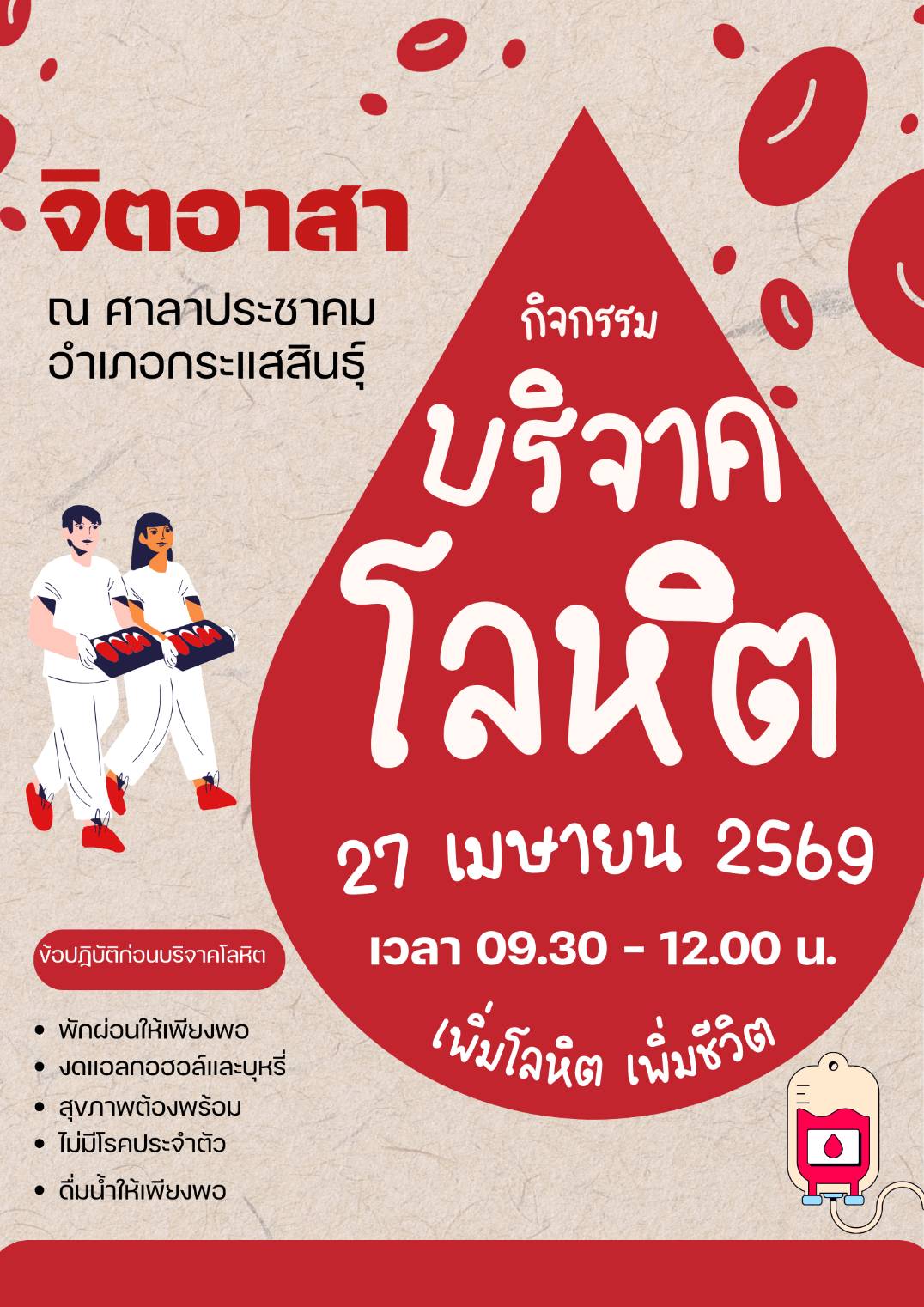 ขอเชิญทุกท่านร่วมบริจาคโลหิต ในวันที่ 27 เมษายน 2569 เวลา 09.30 – 12.00 น. ณ ศาลาประชาคม อำเภอ